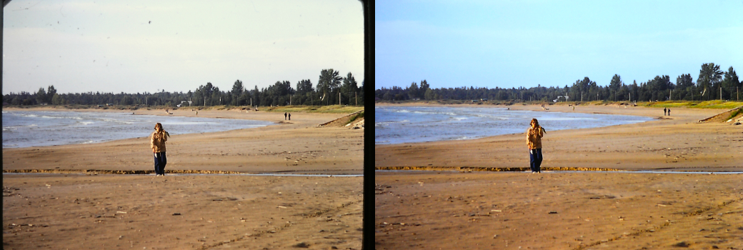 The woman on the beach is my mom at Sauble Beach, ON, taken in either Spring or Fall. It's an old 35mm slide photo from the 70's, which I scanned and restored.